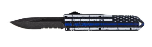 This Master Cutlery automatic knife is an excellent choice for everyday carry and versatile applications. Constructed with a robust zinc alloy handle and a stonewashed 3Cr13 steel blade, it measures 9 inches with a 3.5-inch double-sided, partially serrated spear point blade. A convenient carrying pouch is included.