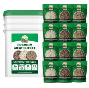 This bucket contains a hearty selection of freeze-dried meats, including chicken, sausage, and beef. Freeze-dried protein is always difficult to find, so grab some while you can.